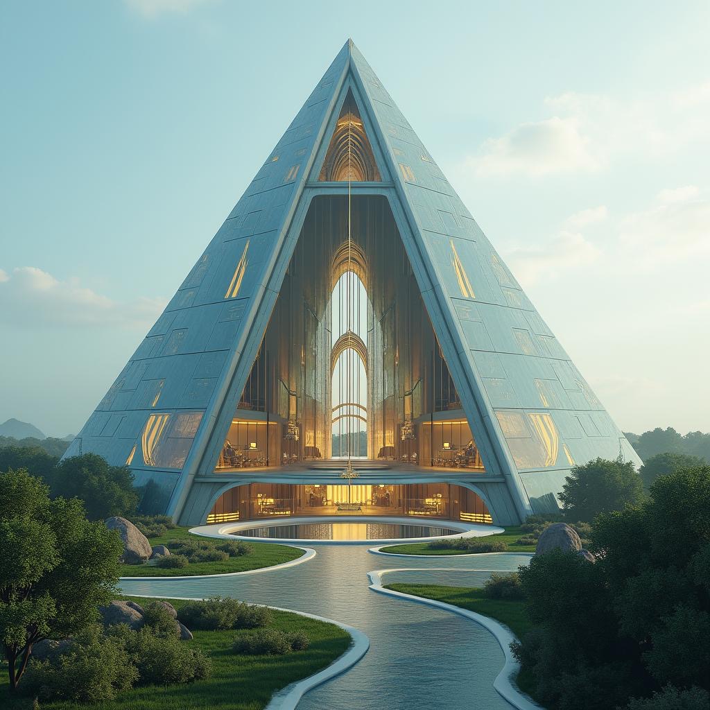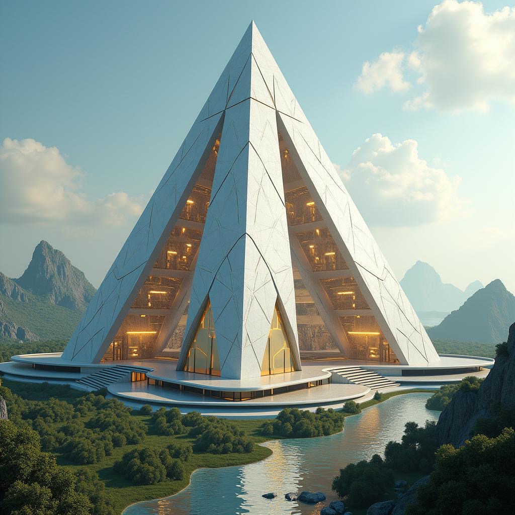 - The Energy-Conductive Shell: The exterior of the building would feature a sleek, angular pyramid shape. The surface would be made from a combination of natural, sustainable materials like translucent solar glass and energy-efficient panels. These materials would not only capture and store solar energy but also convert it into electricity that powers the building. The design would also include geodesic patterns to amplify energy frequencies and enhance the structure’s healing properties.