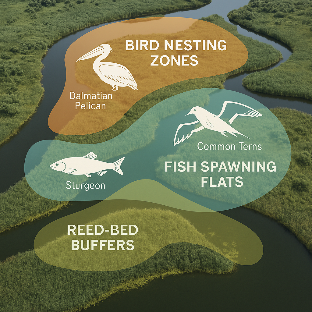 The HydroSerpent is sited within the Sulina Arm of the Danube Delta—Europe’s largest wetland and one of its richest biospheres. The site is characterized by fluvial sedimentation, dynamic hydrology, and a fragile ecology home to over 300 species of birds and 45 freshwater fish. The architecture is embedded in this context not as intervention but as participant. Its meandering footprint mimics the braided morphology of the river. Its materiality and systems are selected to support microbial life, filter silt, shade against thermal spikes, and host amphibious flora. In doing so, HydroSerpent honors place as ecological memory.