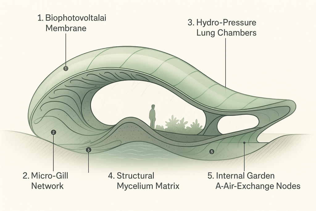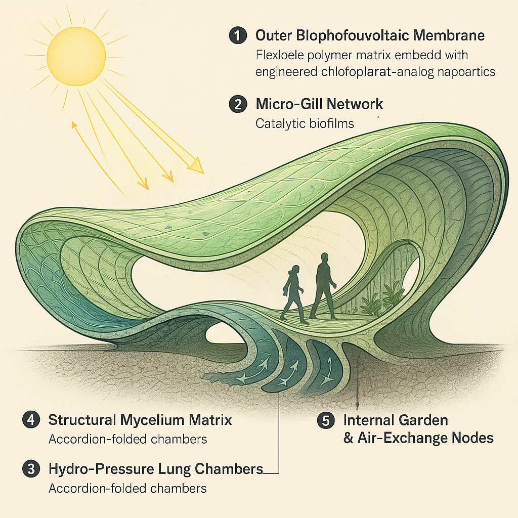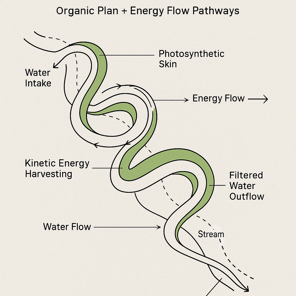 Biophotovoltaic Membrane: The outer skin contains chloroplast-inspired photovoltaic cells capable of converting light into electrical energy. Hydrokinetic Lung Chambers: Subfloor bellows expand and contract with water pressure, powering embedded micro-turbines. Mycelial Air Filtration: Air entering the structure is purified through moss and mycelium-infused wall systems. Water Regeneration: Shallow troughs channel stream water into engineered “gills” that filter, oxygenate, and cool the flow. Circadian Biofeedback: Light, sound, and humidity are modulated through biometric sensors that respond to occupants’ physiology.