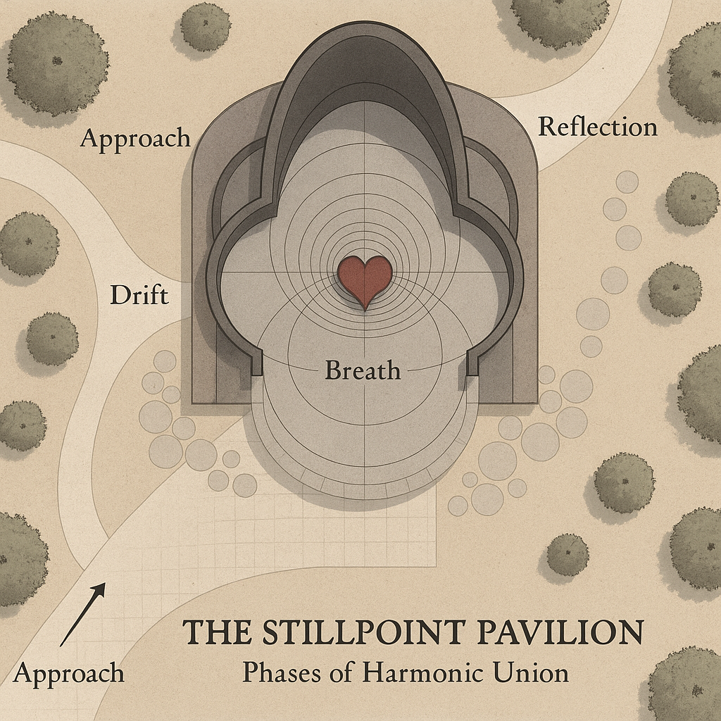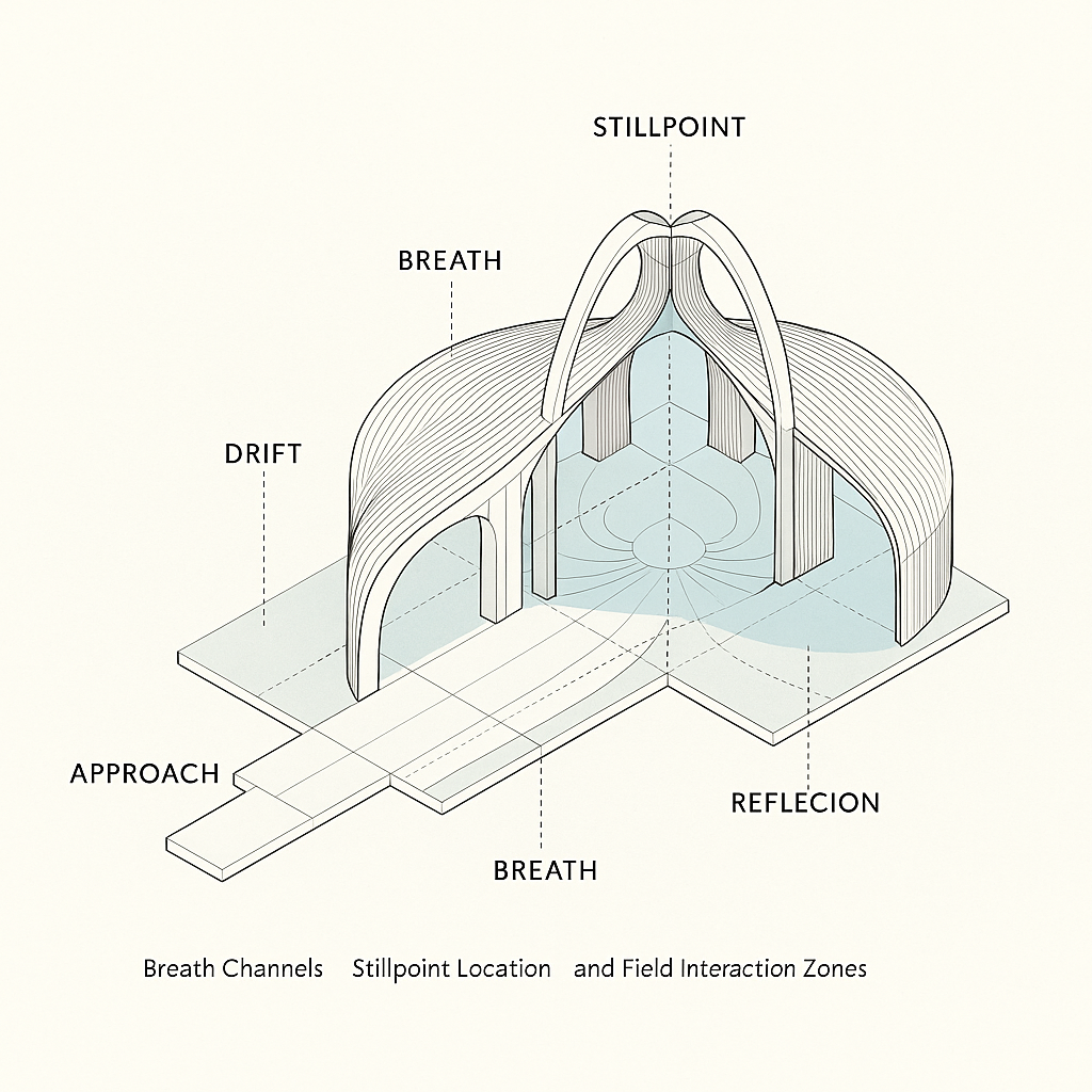 The Stillpoint Pavilion is a ritualized architectural structure based on the psychoenergetic design principles of Lambda Field Dynamics. It is engineered to induce harmonic coherence between individuals through spatial sequencing, breath entrainment, and symbolic geometry. This structure functions as both a spiritual healing chamber and a premium ceremonial venue.