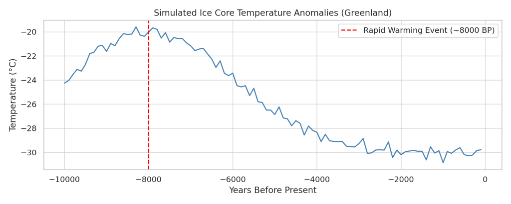 Figure 2 – Ice core records showing a sudden warming event around 8,000 years ago. Such shifts may correlate with crustal movement over geothermal regions.